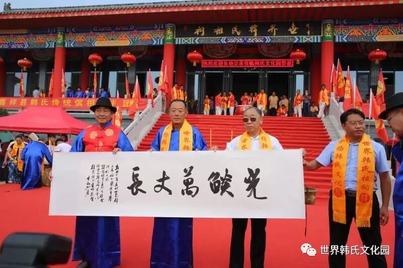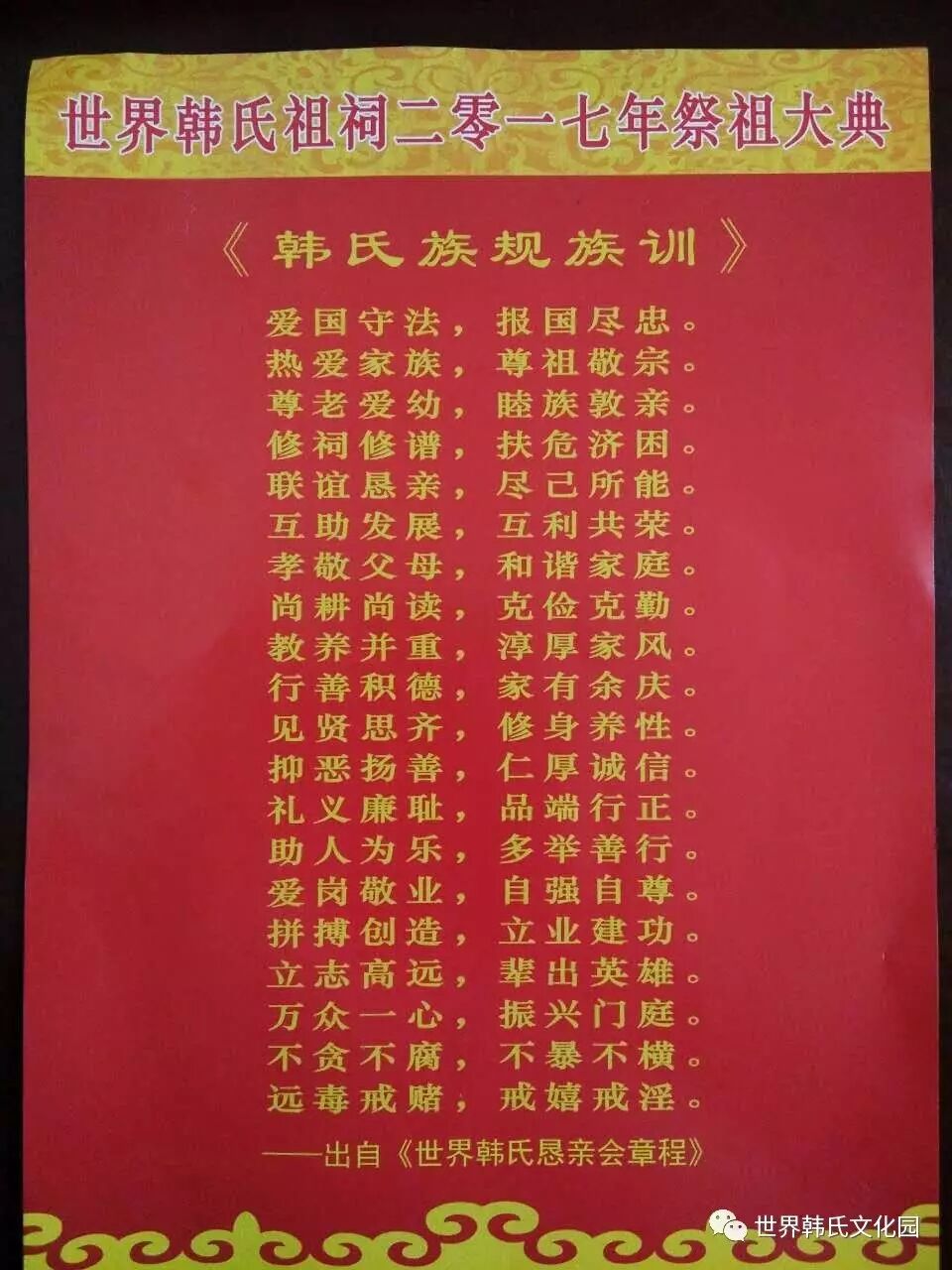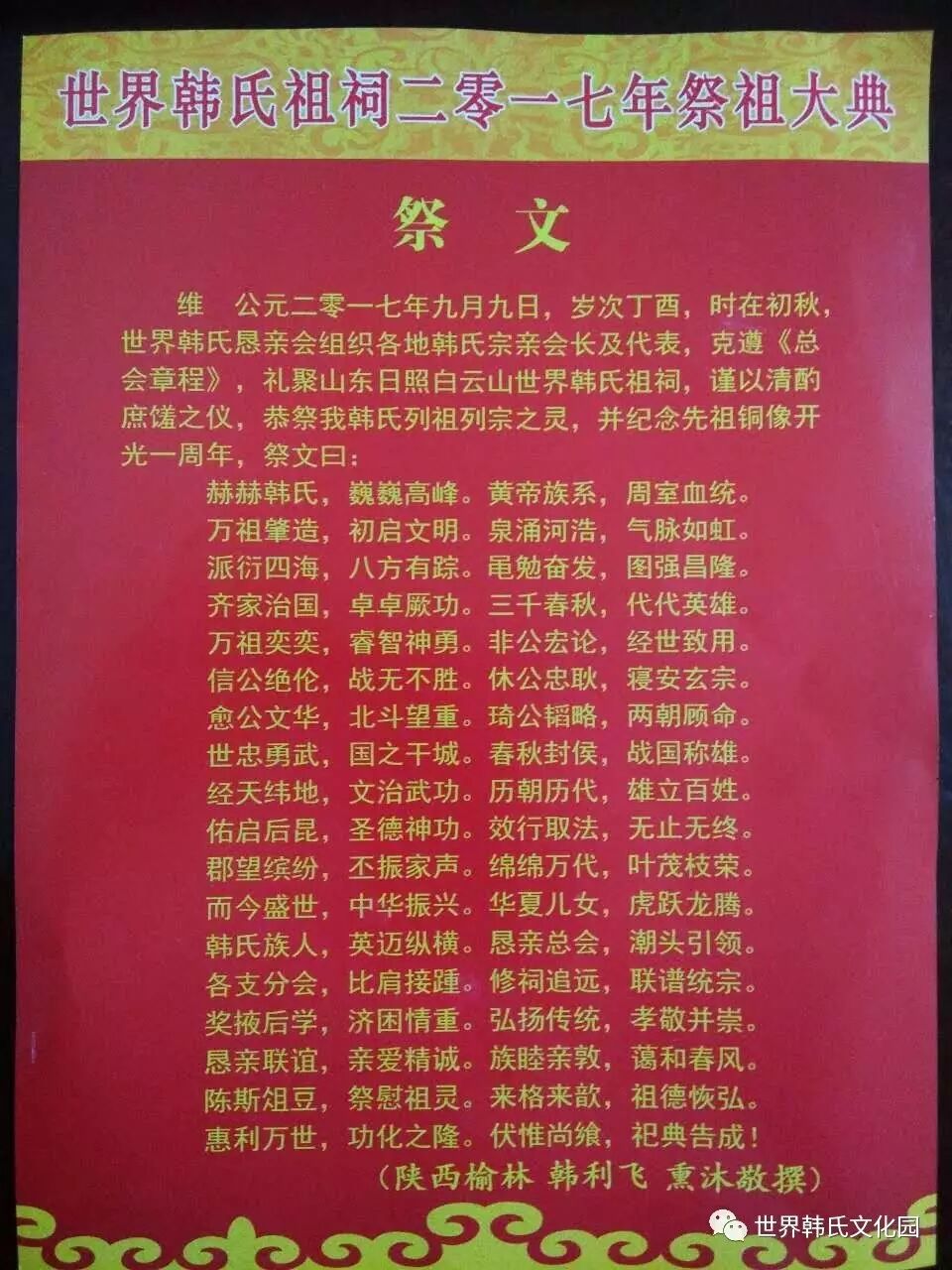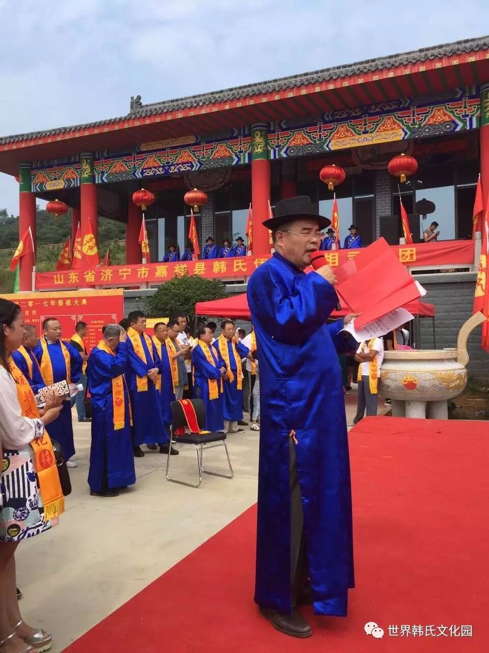 2017年9月9日,世界韩氏祖祠祭祖日,为纪念世界韩氏祖祠开光一周年,世界韩氏祖祠举行了全国韩氏祭祖大典活动,来自全国各地1000余名宗亲参加。活动分为歌舞朝祖、祭天祭地、祭祀毛主席、祭拜先祖、诵读族训族规、瞻仰祖像、个人祭拜、书画族谱展览、义诊等多个环节。