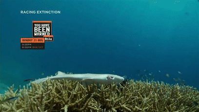 这只刚被人类割走鱼鳍的鲨鱼,想游但已经游不动了。它从水面坠落到珊瑚丛上,绝望等死。