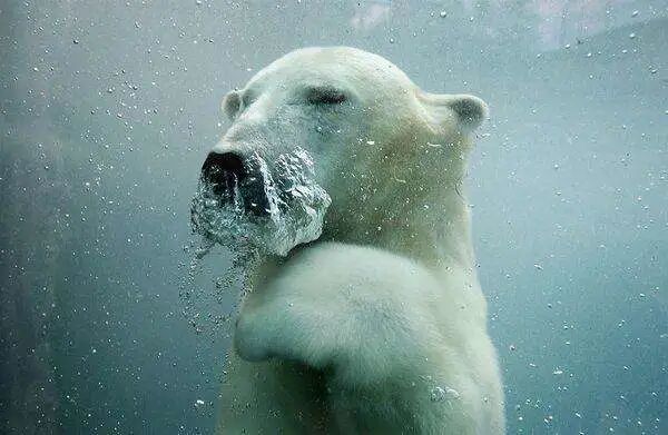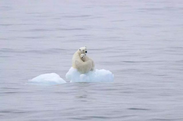 *冰川融化,北极熊出海捕食,游到体力不支也看不到一块冰面可以让它上岸休息,就这样永远地沉入大海
