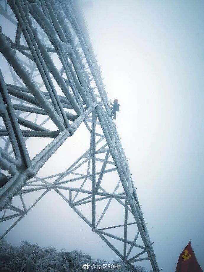 输电运行检修的员工冒着大雪,爬上铁塔,边敲冰,边安装融冰短接线。↓