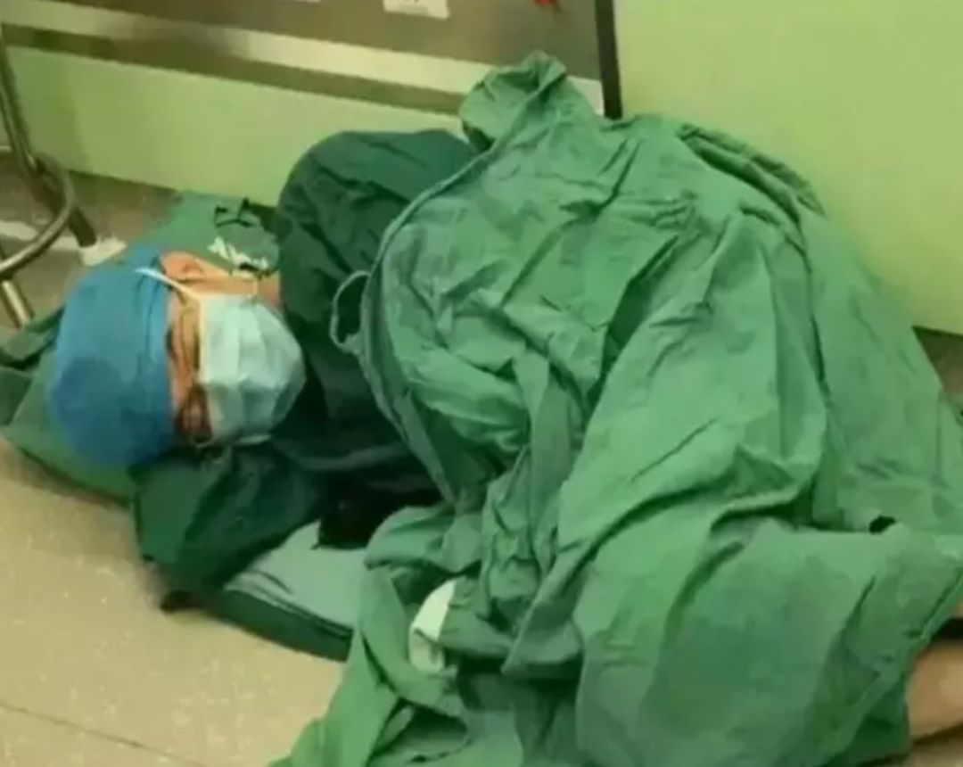 一天完成十几台手术的他,直接在地上睡着了。↓
