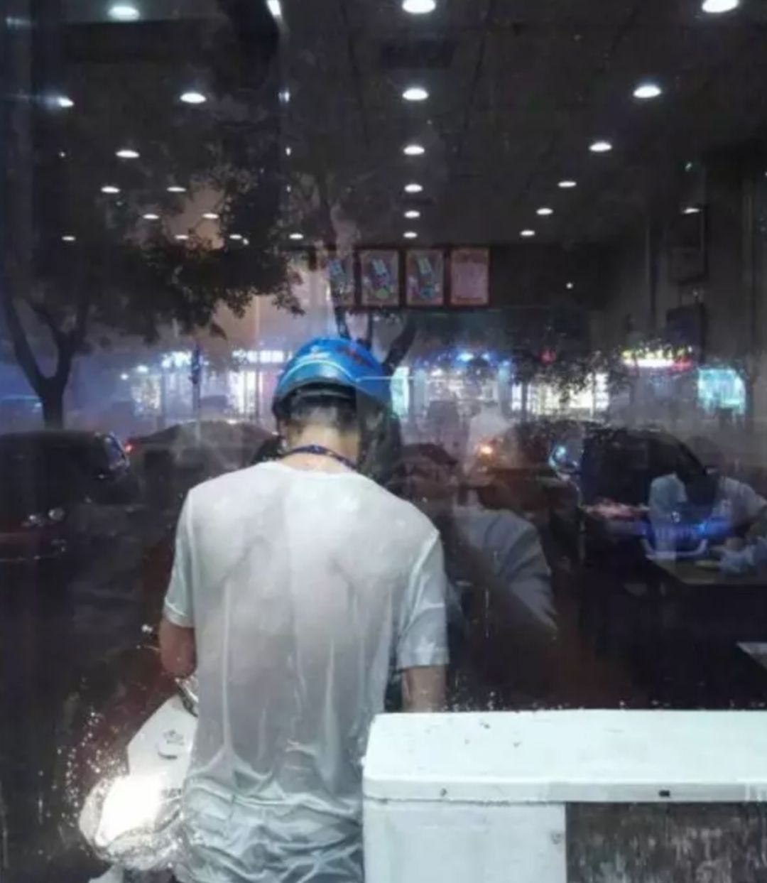 外卖小哥全身湿透,但接到催单电话后,又立刻冲进了雨中。↓