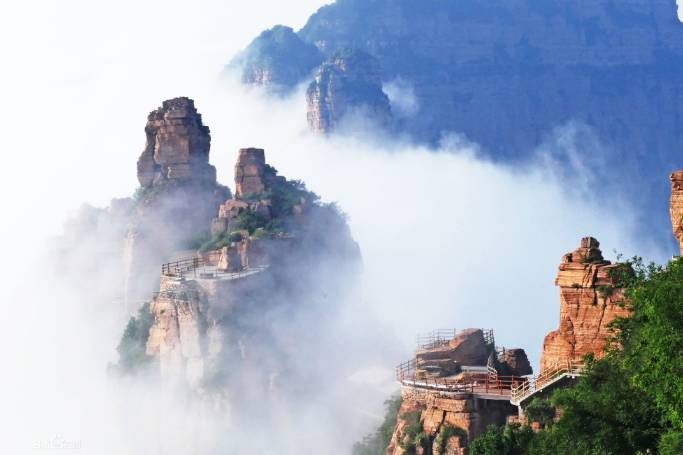 除此之外,东太行的云海也是极美的。因地势高,雨后乍晴,常有缭绕的白云沿着山谷升起,沿着栈道绵延,行走于栈道之上,如踏云而行,此时漫步栈道,美哉壮哉,因此有“云端栈道”之美誉。