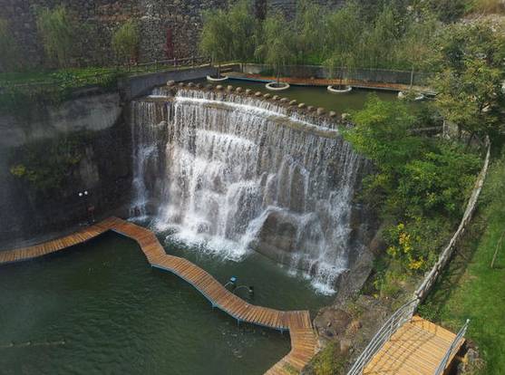 瀑布四面及水底都用石块堆砌而成
