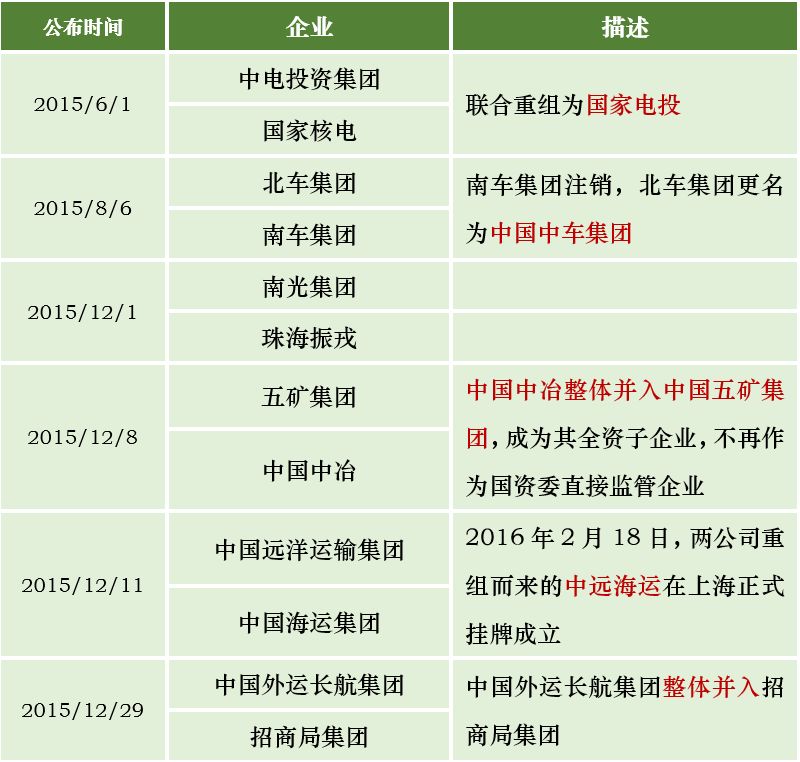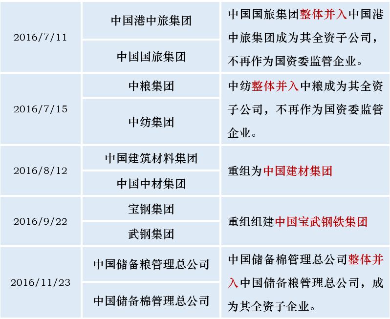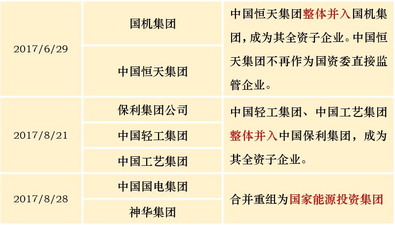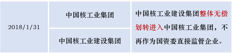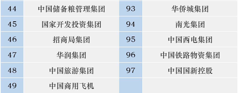 2018年首月,国资委公布中核建集团与中核集团实施重组。中核建集团整体无偿划转进入中核集团,不再作为国资委直接监管企业。至此,中央企业数量减至97家。 截止目前 国资委直接监管央企97家 97家央企中 1. 序号1-49的49家中央企业为中管(副部级)央企,领导班子由国资委企干一局管理(其中企业正职由中组部任命); 2. 序号50-97的48家中央企业为司局级央企,领导班子由国资委企干二局管理 近三年实施重组的央企