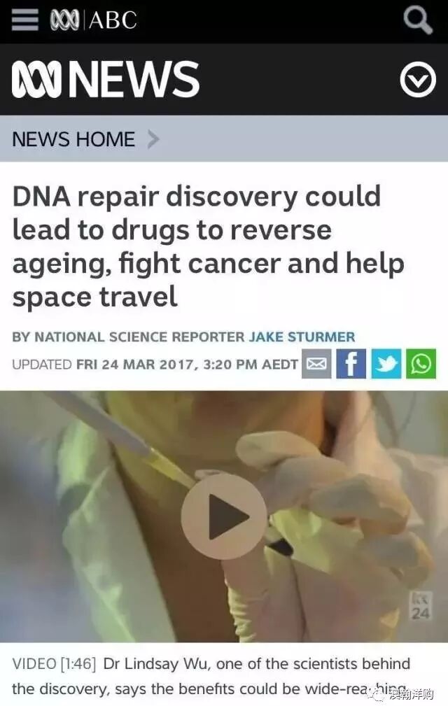 澳洲科学新突破 就在近期,澳洲科学家们研制出了一种“神药”,不仅可以治疗超过20种疑难疾病,还可以抗衰老、治疗癌症! 据《澳洲广播公司》报道,来自悉尼新南威尔士大学的科学家们发现了一种可以修复受损DNA的维他命: 辅酶I(NAD) “通过辅酶I对受损DNA的修复,可以帮助人类恢复机体功能、防止癌症、延缓衰老,真正实现“长生不老”的神话!” 此项研究由来自新南威尔士大学和哈佛大学的科学家David Sinclair(辛克莱尔)和他的同事Dr. Lindsay Wu所带领组成的科学家团队共同研发。