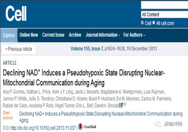 “当细胞内辅酶I(NAD+)含量不足时,会导致细胞核与线粒体之间的交流出现障碍,这是造成衰老的根本原因。” -2013年11月《细胞》期刊 http://www.cell.com/abstract/S0092-8674(13)01521-3