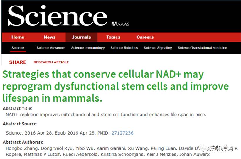 “补充NAD+能重调失能的干细胞并且延长哺乳动物的寿命。” -《科学》期刊2016年4月