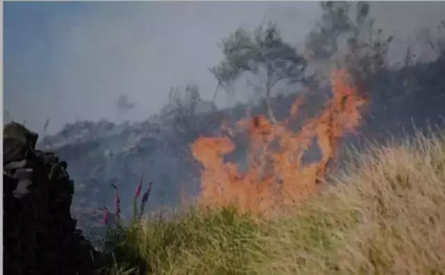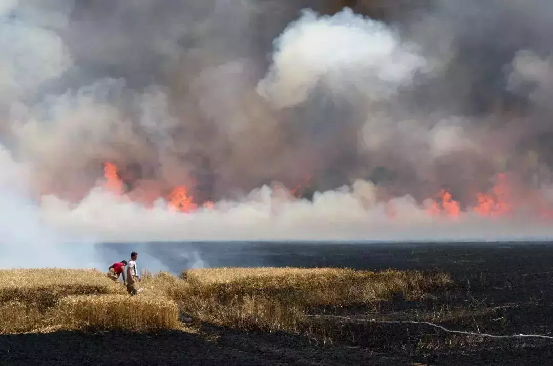 照片中,两个人站在田间,望着漫天大火将田地烧成焦土,却无能为力。