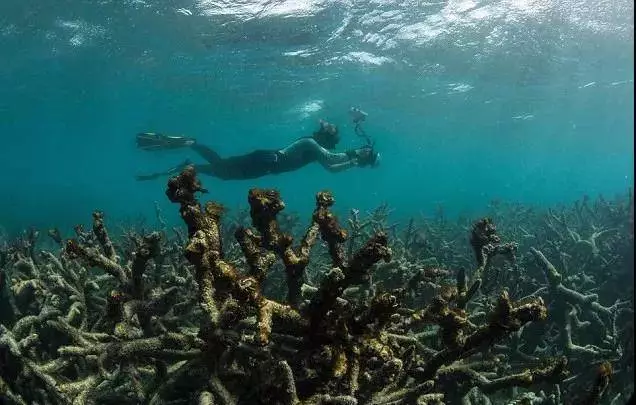 然而现在却是这样的,整整1500公里的珊瑚礁枯萎死去,静静地躺在水底,如同累累白骨,宛若一片坟场。