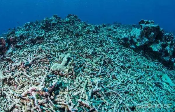 因为全球变暖,海水升温,珊瑚礁体内的共生藻死去,只剩下一片片惨不忍睹的白色骨殖。