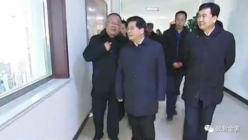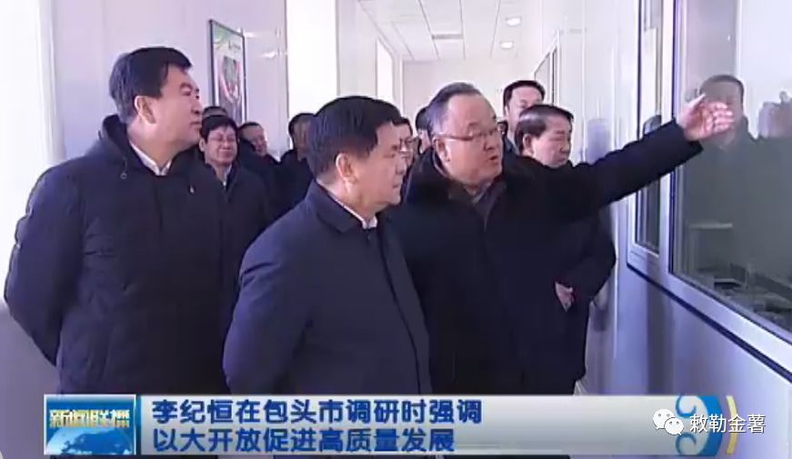 自治区党委书记、人大常委会主任李纪恒(中)调研田丰农牧集团,董事长马爱峰(左)做讲解,自治区党委常委、包头市委书记张院忠陪同调研(右)