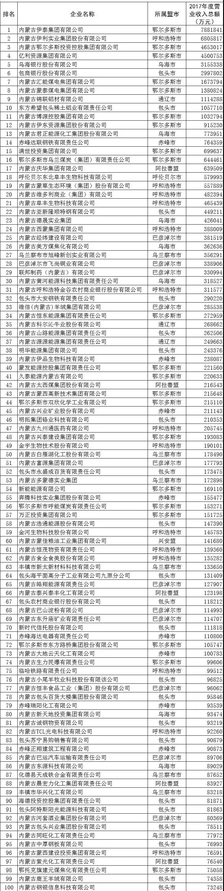 入围门槛 2018年,内蒙古民营企业100强入围门槛达到7.32亿元,比上一年增加1.15亿元。 营业收入 百强企业全年实现营业收入5631.54亿元,同比增长32.03%。 年营业收入超100亿的民营企业为11家,比上年增加2家;超50亿元的民营企业为19家,比上年增加3家。 经营利润 2017年,全区民企100强在营业收入增长的同时,经营利润实现大幅回升,全年实现税后净利润466.68亿元,同比增长87.69%,其中净利润超亿元的企业有48家,比上年增加6家。 资产总额 全区民企100强拥有资产总额16063.16亿元,比上年增长25.02%。 民企100强中资产规模超百亿元的有26家,比上年增加6家;资产规模50-100亿元的有17家,比上年增加4家。 区域分布 包头市:22家 鄂尔多斯市:21家 呼和浩特市:14家 赤峰市:8家 乌海市:7家 乌兰察布市:7家 阿拉善盟:5家 通辽市:3家 呼伦贝尔市:1家 兴安盟:1家 产业分布 第一产业:2家 第二产业:70家 第三产业:28家 制造业:47家 航拍伊泰(视频时长5:29 ) 内蒙古民营企业100强名单 为进一步激发我区民营企业发展活力,发挥百强民营企业的示范带动作用,推动我区民营经济高质量发展,自治区工商联在各地区、各有关部门的大力支持配合下,在对全区上规模民营企业进行调研的基础上,开展了“2018内蒙古民营企业100强”排序活动。排序按照全国工商联“中国民营企业500强”排名方法,采取企业自愿申报的原则,以2017年度企业营业收入总额作为主要指标,对参加申报的民营企业进行了排序,产生2018内蒙古民营企业100强名单。现将排序结果予以公布: 内蒙古民营企业100强成为稳定经济的重要基础、国家税收的重要来源、技术创新的重要主体、金融发展的重要依托、经济持续健康发展的重要力量。 祝贺入围2018内蒙古民营企业100强的企业! 伊泰集团总部 伊泰煤化工项目 伊泰绿色矿山