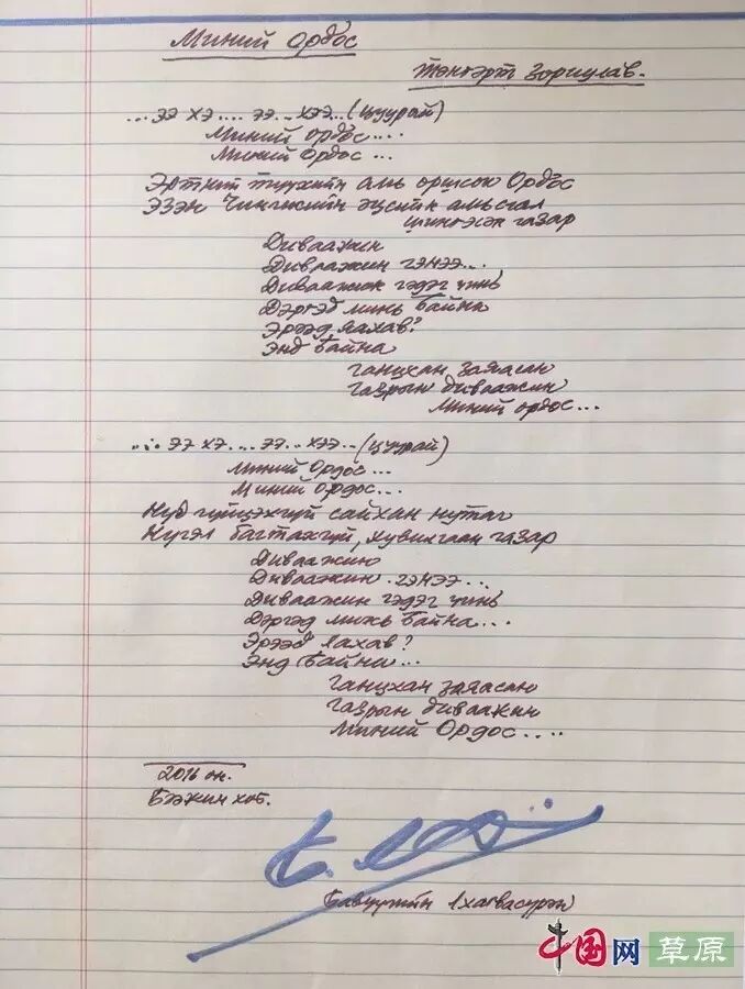 “草原歌神”腾格尔与“蒙古国著名诗人”巴·拉哈巴苏荣合作的歌唱家乡的蒙古语新歌《我的鄂尔多斯》在中国网草原频道重磅首发!词曲作者手稿首度曝光。
