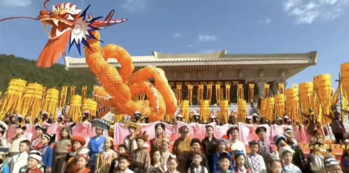 祥云绕桥山,巨龙腾长空。在盛大的乐舞告祭中,一条长56米的“金色飞龙”从祭台中心盘旋腾跃而起,承载着炎黄子孙对人文初祖无限崇敬与感恩之心、承载着实现中华民族伟大复兴的中国梦,飞上云霄。