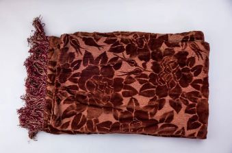 这条披肩为丝制,长158厘米,宽50厘米,正面织有玫瑰红色牡丹花图案,背里为白色。织工考究,质地精良,虽历经60多年,牡丹花依然鲜艳如新,华艳富丽,曼妙万千。