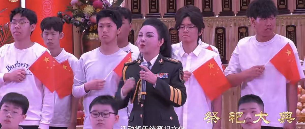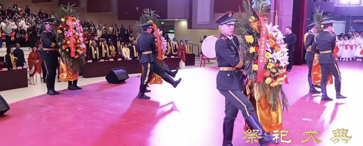 祭祀仪程严格遵循古制,在庄严肃穆的氛围中圆满礼成。这一神圣的仪式不仅是对先祖深情呼唤,更是中华礼乐文明跨越时空的生动展现。文艺展演环节小志愿者以手语舞《感恩词》传递纯净的感恩之心。陶红女士深情演唱《祖德流芳》《礼乐兴邦》颂扬祖德期盼礼乐复兴,大典特设敬献花篮仪式,全体肃立,向革命先烈三鞠躬。