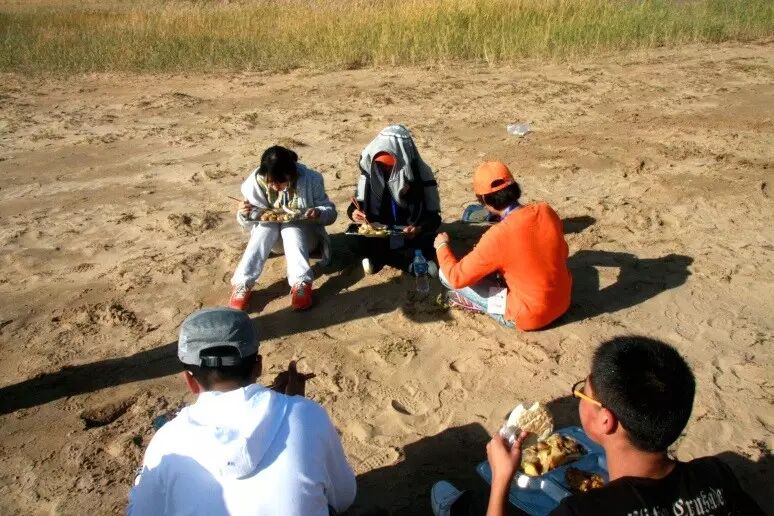 大漠穿越的营员正在享用亲手烹饪的“沙拌饭”