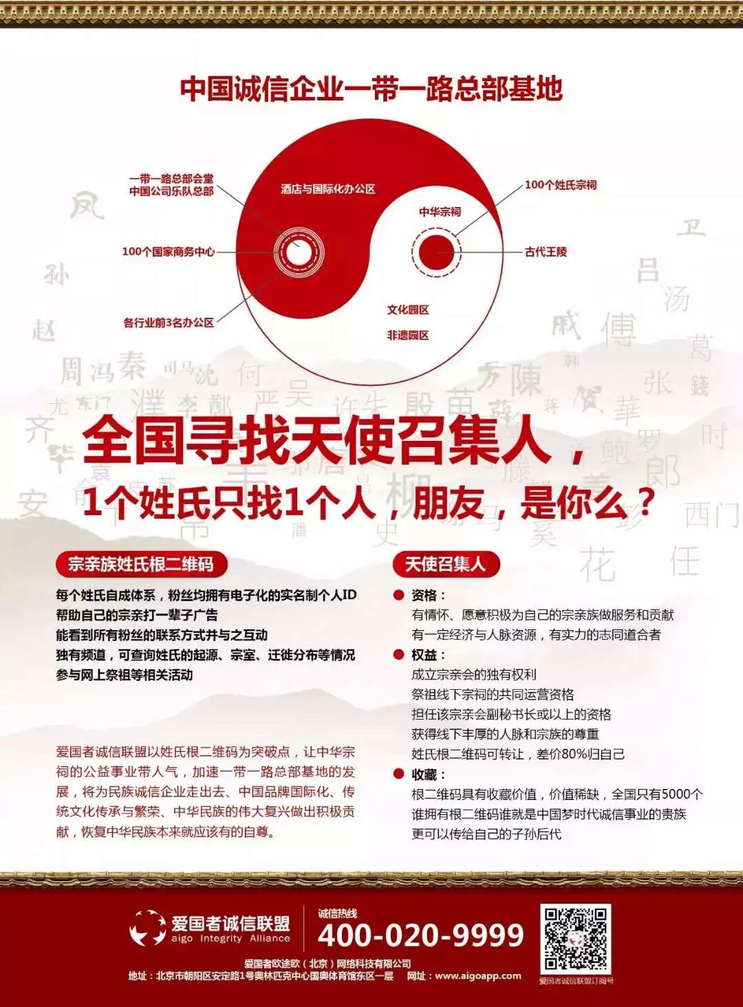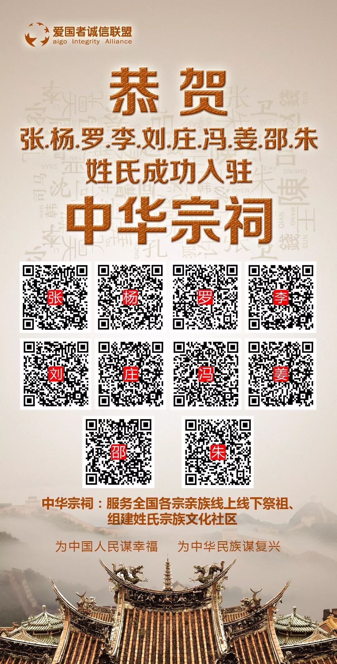 四大古代文明只有中华文明源远流长,中华民族宗亲族起到重要作用。我们要响应“为人民谋幸福 为民族谋复兴”的伟大号召,用中华宗祠团结全球华人,一起来支持中华民族的伟大复兴、支持中国梦、支持中国的诚信品牌。我们应该做好一带一路总部基地,用实名制把水军干掉,用竞质排名由老百姓选出各行各业质量好、研发好、服务好的好品牌。