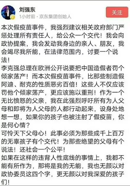 刘强东在微博上发文称:本次假疫苗事件,我强烈建议相关政府部门严惩处理所有责任人,给公众一个交代!我会想政协提案,我会发动我身边的亲人、朋友,我会竭尽我所能,在法律范围内,讨要一个说法!”