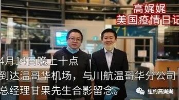 姜柳均先生在中美两国都有企业。疫情爆发之前,常因为业务的关系往来于中美两国之间。中国爆发疫情之初,姜柳均一直关注着全球疫情的发展,同时尽己所能为中国抗疫尽一份绵薄之力。看到中国留学生滞留美国无家可归,他接了11位留学生到家中暂住,为他们提供躲避疫情的安全港。他还将口罩分发给其他需要帮助的人。3月份,我口腔里长了囊肿,需要尽快切除。但美国疫情非常严重,医院人满为患,根本没有办法在美国就医。而医生也建议我,为避免囊肿恶化必须要尽快治疗。于是,我只能冒着受感染的危险以及航班的不确定等很多因素尽快回到成都,便于我囊肿的治疗。本来从纽约有直达成都的飞机,但是因为疫情的原因停飞了。姜总所买的四川航空的机票只能从加拿大的温哥华飞成都。这是一个大难题。他需要先从新泽西到纽约,飞到西雅图,然后再从西雅图飞到温哥华。我们的行程是4月7日早上,从纽约到温哥华,再坐四川航空的飞机从温哥华飞成都。在平时很简单的行程,疫情期间却经历波折。首先是买票的时候。为了保险,我们最初预定了三种从新泽西纽瓦克机场到温哥华的方案。一是在西雅图转机,二是在洛杉矶转机,三是在旧金山转机,再分别转到温哥华机场。我在4月4日就在网上把三条线路的机票都预订好。4月5日,四川航空温哥华到成都的机票确定好后,考虑到时间衔接上的方便,我们敲定了4月7日纽瓦克经旧金山到温哥华的行程,就把其它两段备用机票都退了。
