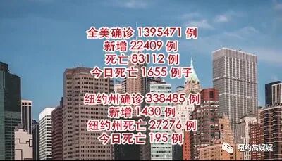 截止5月12日,美国累计确诊1395471 例,新增确诊22409 例,累计死亡 83112 例,新增死亡 1655 例。纽约州累计确诊338485 例,新增1430 例,累计死亡 27276 例,新增死亡 195 例。