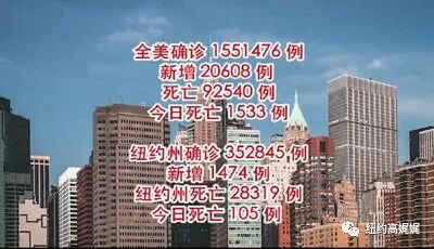 截止5月19日,美国累计确诊1551476例,新增确诊20608例,累计死亡92540例,新增死亡1533例。纽约州累计确诊352845例,新增1474例,累计死亡28319例,新增死亡105例。