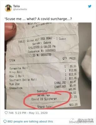 账单上显示,她在用餐后被收取了一项名为“COVID-19”的费用,这位顾客表示她很愤怒。这项费用是美国一些餐馆为了挽救生意,决定向顾客收取的少量额外费,算是餐馆对于因疫情而生意不佳的一种自救。对此,网友们各执一词,支持餐馆收费的顾客略占上风,有一些持反对意见的网友也并不是反对收费本身,而是强调在收费之前,要告知顾客有这么一项,不能啥都不说默默地就加进去。现在虽然正在陆续复工,但对于餐饮业的打击很大,很多餐馆暂时很难从寒冬中迅速恢复元气。许多餐馆由于不堪财务等压力纷纷宣布关门。餐馆是需要长期经营的,与顾客和睦相处,不仅要在口味上征服对方的胃,还要在服务等各方面让客户能心甘情愿走进餐馆消费。不得不说,餐厅的经营,真的是一门学问。对于这笔“COVID-19”费用,你会愿意支付吗?特朗普又“带货”了!