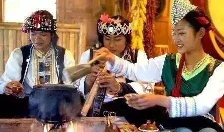 居住在云南大理一带的白族兄弟,十分好客。他们敬客的“三道茶”是名闻遐迩的。所谓“三道茶”就是茶分三道,分别是苦茶、甜茶、回味茶。“一苦、二甜、三回味”蕴含着白族人民深厚的文化涵养和他们对生活的态度与认识。