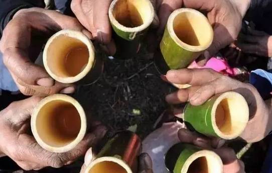 云南景颇族的腌茶不是为了解渴,而是为了佐食。这种腌茶的制作较为繁杂,时间跨度也较大。每年春雨霏霏之季,将采摘的鲜嫩茶叶洗净,再用竹箩摊开晾干,然后再拌上食盐、辣椒,放进竹筒内,层层捣紧后,将竹筒口封起来。放置到阴凉处3个月后,便可享用。