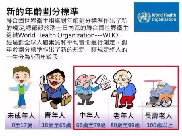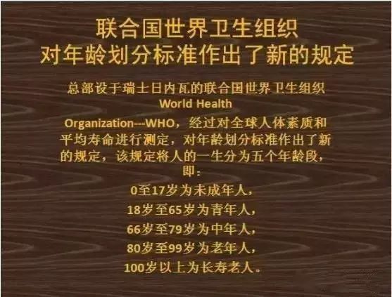 总部设于瑞士日内瓦的联合国世界卫生组织,经过对全球人体素质和平均寿命进行测定,对年龄划分标准作出了新的规定。