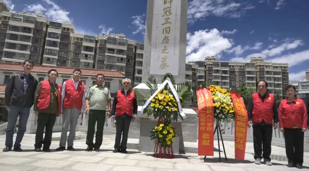 2018年6月30日下午,参加“中国第八届‘红色工程·感恩行动’全国行走进西藏活动”部分的领导、嘉宾在拉萨市西藏职业技术学院瞻仰谭冠三纪念园。这是瞻仰活动现场。左二至左七:原成都军区保健主任医师、国家领导人多次接见英模人物曾兴祥,原中共中央党史研究室二部主任齐彪,原武警武汉指挥学校副校长、红色文化研究院执行院长姜文华,老红军谭冠三中将之子、原林芝军分区副司令谭戎生,中央纪委扶贫办原主任齐建民,原中共中央党史研究室宣教局副巡视员邢济萍。