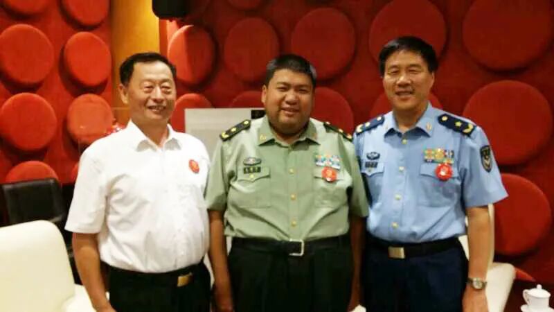 老红军、原成都军区政委万海峰上将(中)同秘书孙德阁大校(左)、原武警武汉指挥学校副校长、中国萧军研究会副会长兼红色文化研究院执行院长姜文华(右)合影。