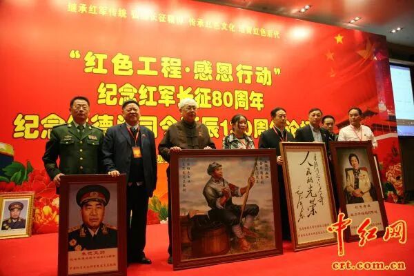 2016年4月10日,红色工程·感恩行动暨纪念朱德总司令诞辰130周年论坛在北京歌华开元大酒店举行。这是艺术家向大会赠送艺术品。左一为红色文化研究院执行院长姜文华,左三为陈毅元帅之子、中国人民对外友好协会原会长陈昊苏,左六为全国红办副主任胡呈军。(中红网李学叶摄)