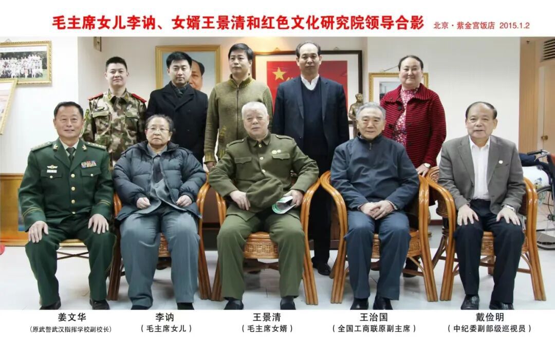 2014年1月24日,纪念红军长征胜利80周年系列活动暨老一辈无产阶级革命家谢觉哉夫人、百岁老红军王定国华诞在北京歌华开元大酒店隆重举行。前排坐者为老红军王定国。后排右一至右二:全国工商联原副主席、红色文化研究院院长王治国,谢觉哉、王定国之子谢亚旭。右四至右六:谢觉哉、王定国之子谢飘,老红军、原成都军区政委万海峰,红色文化研究院执行院长姜文华。