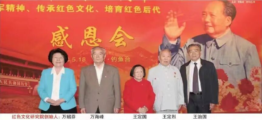 上图左起:共和国第一位女省委书记、中共中央统战部原副部长(正部级)万绍芬,老红军、原成都军区政委万海峰上将,老一辈无产阶级革命家谢觉哉夫人、老红军王定国,老红军、原空军副司令员王定烈,全国工商联原副主席、红色文化研究院院长王治国。