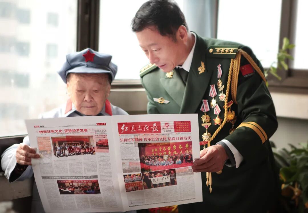 老一辈无产阶级革命家谢觉哉夫人、老红军王定国和红色文化研究院执行院长姜文华在一起看红色报刊。