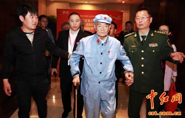 2016年4月10日,红色工程·感恩行动暨纪念朱德总司令诞辰130周年论坛在北京歌华开元大酒店举行。这是老红军、成都军区原政委万海峰上将(右二)由姜文华院长(右一)等陪同,走进论坛会场。(中红网红色图库)