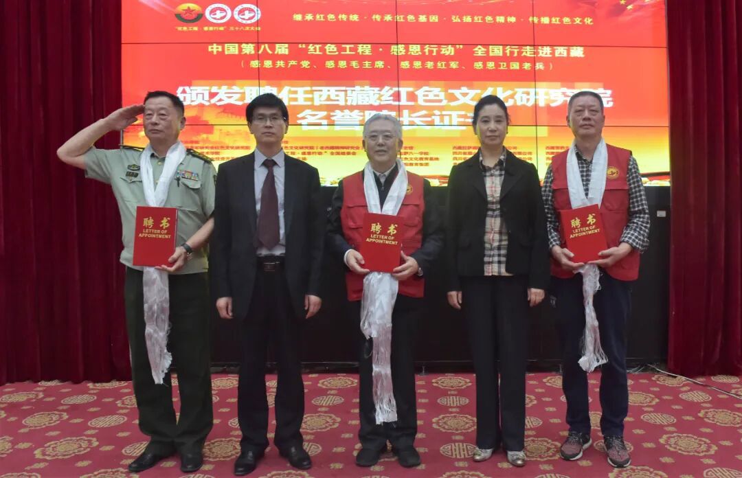 2018年6月30日下午,中国第八届“红色工程·感恩行动”全国行走进西藏(感恩共产党 感恩毛主席 感恩老红军 感恩卫国老兵)、纪念中国共产党成立97周年、纪念中国人民解放军建军91周年、纪念毛主席诞辰125周年、纪念周总理诞辰120周年、“牢记党的宗旨,弘扬老西藏精神”座谈会、纪念老红军谭冠三中将诞辰110周年活动,在拉萨市西藏职业技术学院学术报告厅举行。这是向西藏红色文化研究院聘任老红军谭冠三中将之子、原林芝军分区副司令谭戎生大校(中),原武警武汉指挥学校副校长(技术四级)、红色文化研究院执行院长姜文华(左一),江西省人大原常委、江西梧桐书院院长任德清(右一)颁发《聘书》。