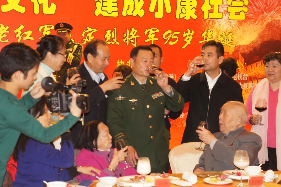 2012年12月3日,由红色文化研究院主办的学习十八大精神、弘扬红军精神、传承红色文化、建成小康社会暨热烈祝贺老红军王定烈将军95岁华诞活动在北京歌华开元大酒店隆重举行。这是姜文华院长(立者右三)向老红军王定烈将军敬酒。坐者左为老红军王定国。