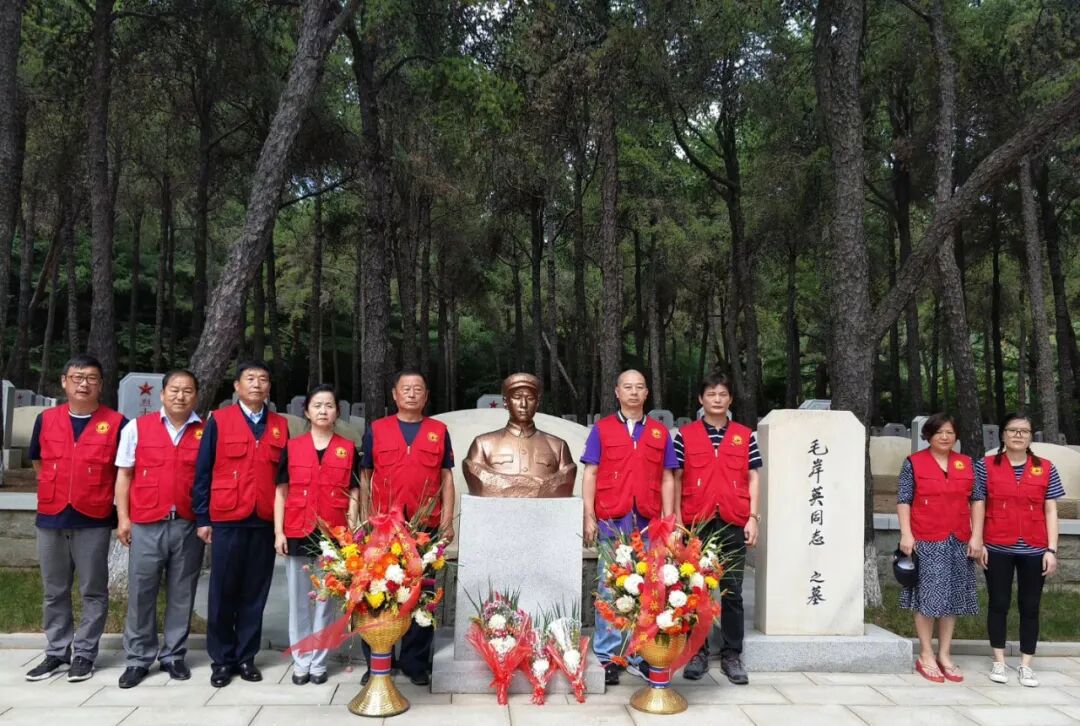 2018年,红色文化研究院执行院长姜文华(左五)一行瞻仰朝鲜桧仓毛岸英之墓。