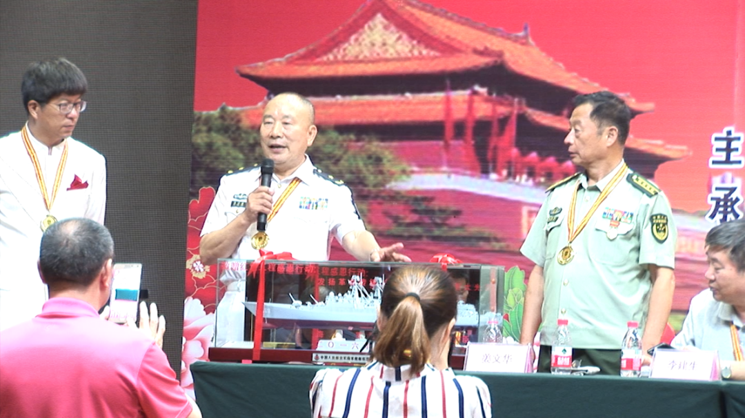 2016年6月25日下午,“红色工程·感恩行动”、纪念中国共产党成立95周年、纪念红军长征胜利80周年、纪念“铁拳团”二连被授予“党的铁军”荣誉称号70周年暨“牢记党的宗旨、弘扬铁军精神”论坛在河南安阳迎宾馆新闻中心大厅举行。吴方臣将军(左二)向论坛组委会赠送军舰模型。右二为姜文华院长,右一坐者为中国共产党主要创始人之一李大钊之孙李建生。