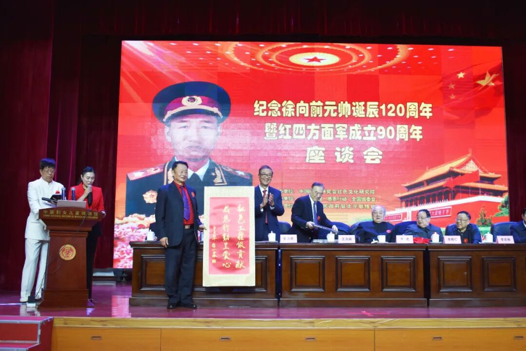 2021年12月6日,纪念徐向前元帅诞辰120周年暨红四方面军成立90周年座谈会在北京中国妇女儿童博物馆举行。原武警武汉指挥学校副校长、中国萧军研究会副会长兼红色文化研究院执行院长姜文华代表组委会向(左三)向徐向前元帅之子、原总装备部科技委员会副主任徐小岩中将(左四)赠送纪念品。左五起:全国工商联原副主席、中国萧军研究会红色文化研究院院长王治国,洪学智上将之子、吉林省原省长洪虎,国防大学原副政委、红色文化研究院名誉院长李殿仁中将,徐向前元帅秘书、原国际关系学院政委李而炳少将。