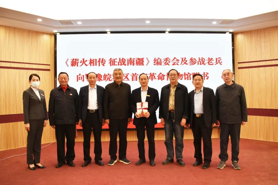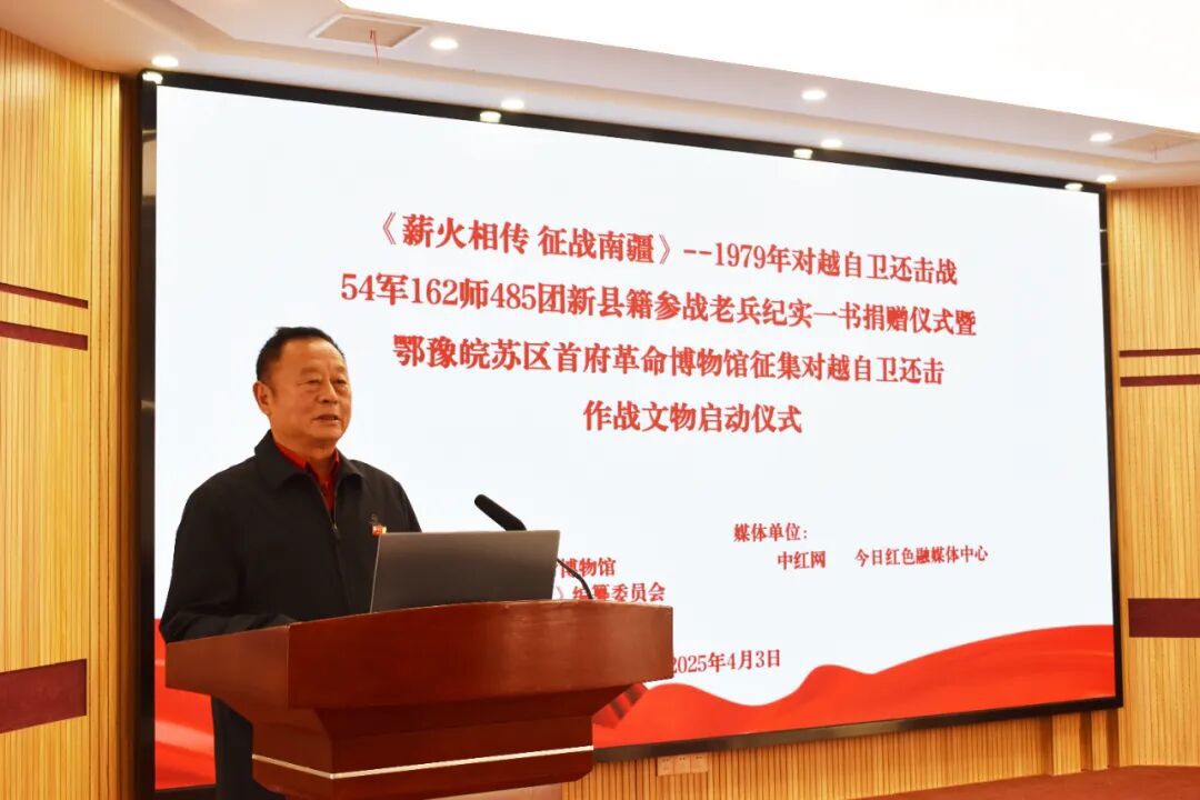 2025年4月3日,《薪火相传 征战南疆》——1979年对越自卫还击战54军162师485团新县籍参战老兵纪实一书捐赠仪式暨鄂豫皖苏区首府革命博物馆征集对越自卫还击作战文物启动仪式在河南新县举行。薪火相传 征战南疆》编撰委员会及参战老兵代表向鄂豫皖苏区首府革命博物馆赠送了《薪火相传 征战南疆》一书,鄂豫皖苏区首府革命博物馆馆长杨裕盛(左五)、副馆长宋晓敏(左一)接受捐赠。左二为姜文华院长。